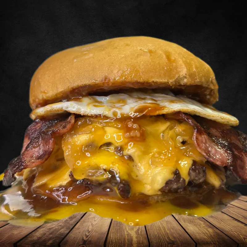 Doble Smash Burger en un esponjoso pan de papa, con crujiente tocino americano, deliciosos aros de cebolla de la casa, cebolla agridulce, pepinillos y una cremosa salsa de queso casera.